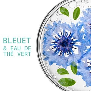 Sa formule contient de l’eau de bleuet bio aux vertus astringentes, apaisantes et tonifiantes et de l’eau de thé vert astringente et reconnue pour éliminer les impuretés et resserrer les pores.